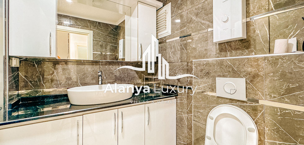 All bathrooms are larger than average, featuring a refined mix of black and white marble tiles that add a modern and timeless character. The living areas are finished with beige cream marble flooring, giving the entire apartment a bright and elegant atmosphere.