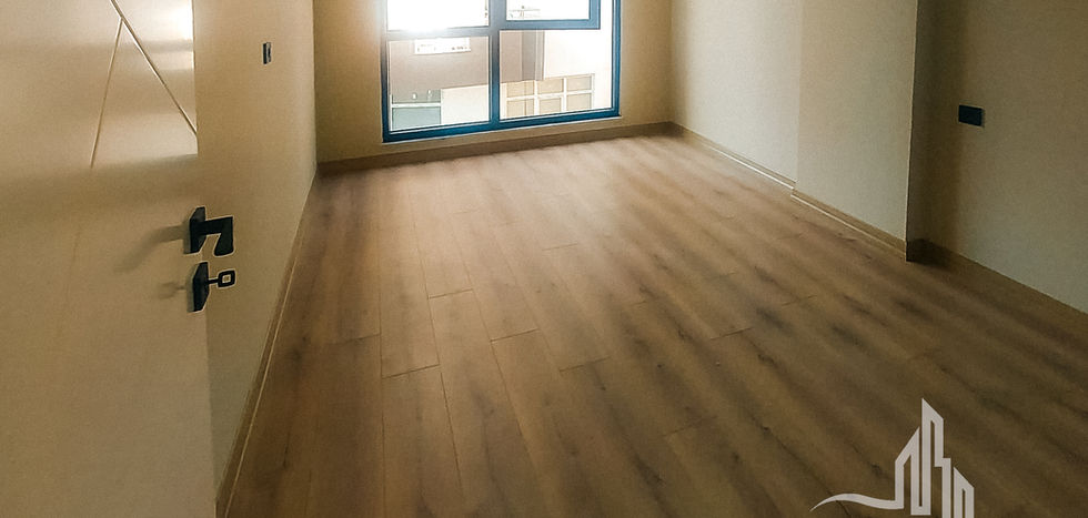 Unfurnished but well-structured, it features a welcoming hallway with built-in wardrobe, a living room with floor-to-ceiling windows, and access to a rectangular terrace with natural stone elements – perfect for outdoor moments. The open kitchen combines black and wood materials, giving a sleek, elegant look.