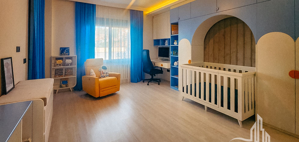 The villa includes three spacious bedrooms and a bright living room with an open-plan kitchen and dining area. The kitchen features a central island with bar chairs and soft lighting, while one of the bedrooms is styled as a playful kids’ or gaming room. Walk-in closets, elegant finishes, and three modern bathrooms complete the indoor space.